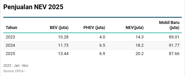 Episentrum industri otomotif global kini bergeser ke Cina. Negeri Tirai Bambu itu menyumbang 68,4% dari total penjualan kendaraan penumpang energi baru global pada Januari–November 2025. Untuk memberikan perspektif, volume penjualan Cina hampir 14 kali lipat lebih banyak dari Jerman yang kini memegang 5% pangsa pasar. Bahkan pada November pangsa pasar Cina di segmen NEV naik lagi menjadi 73,7%