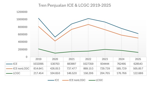 Segmen LCGC juga mengalami tekanan. Sepanjang tahun ini total penjualan mencapai 122.686 unit dengan pangsa pasar 15,3% terhadap total penjualan nasional. Jika dibandingkan 2024 terjadi penurunan 30,1%. Ini menandai penurunan untuk pertamakalinya paska Covid.